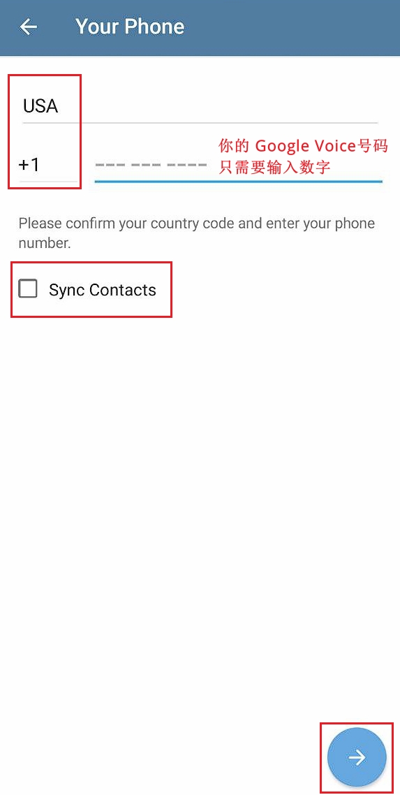 打开 Telegram ,按照图片上的格式进行配置,将地区选择 USA、关闭 Sync Contacts、输入 Google Voice 号码,然后点击右下角按钮,