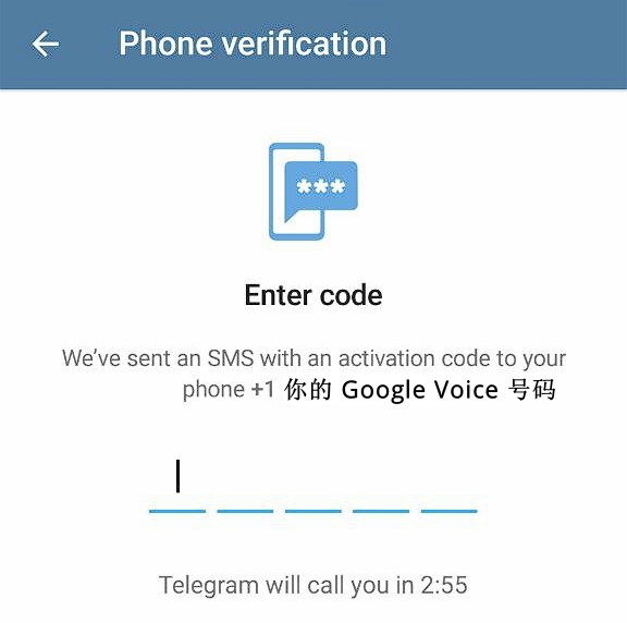 然后 Telegram 会发送验证码给你,只需要到 Google Voice App 或者 网站 上接收下验证码,填写上去即可