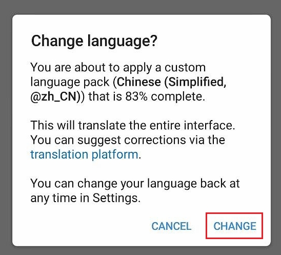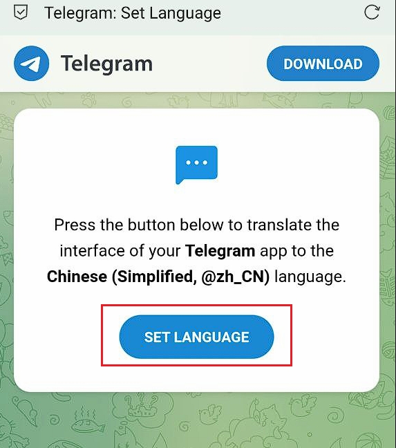 点击 https://t.me/setlanguage/classic-zh-cn 会打开图片中的页面,然后点击「Set language」 (对于 Android、iOS、Windows、Mac 都适用)