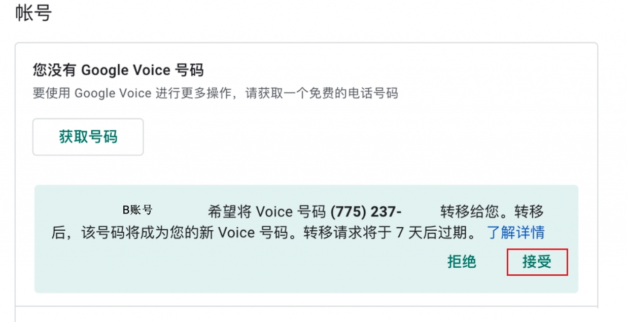 接下来切换到 B账号,然后点击此链接 https://voice.google.com/transfer