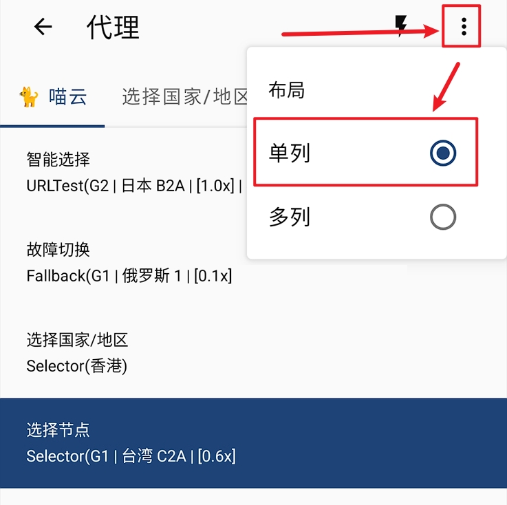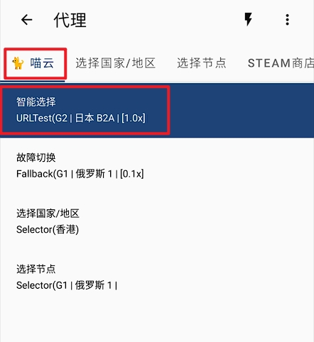 然后点击「🐈喵云」策略组,选择【智能选择】模式。
