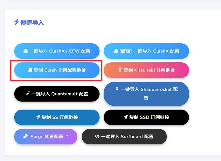 在「用户面板」中下滑,找到「便捷导入」,点击图示的「复制 Clash 托管配置链接按钮」
