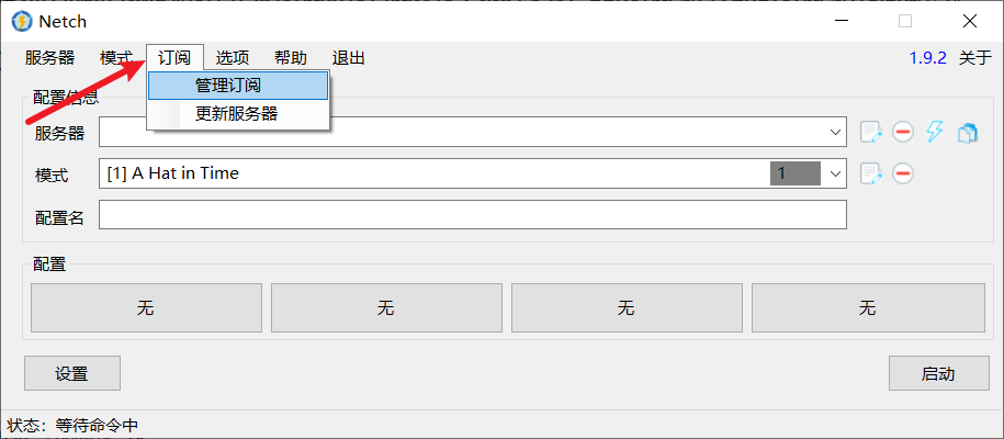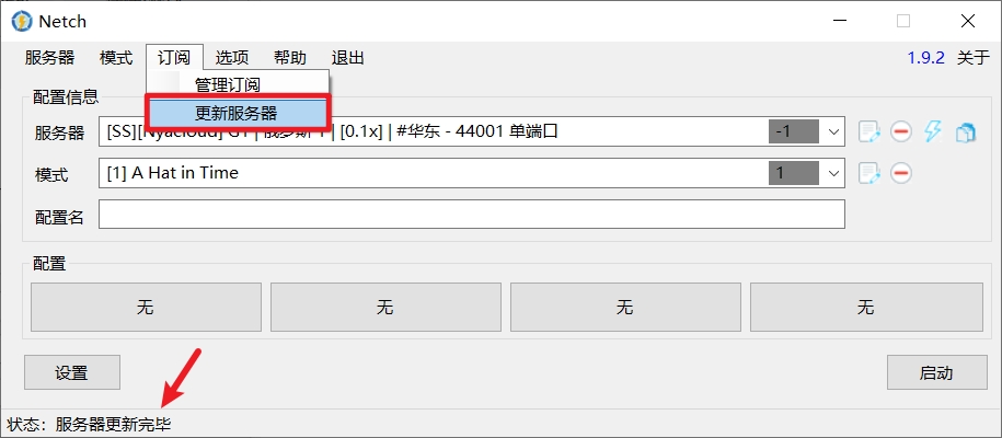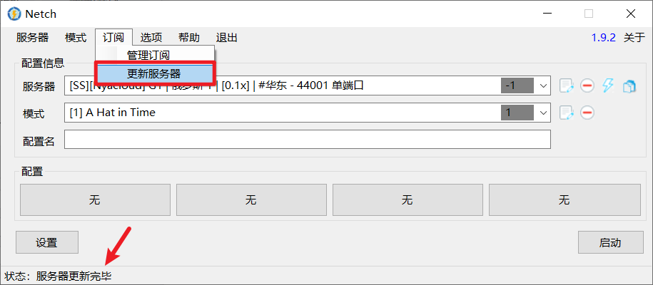 回到主页面,点击「订阅」>「更新服务器」,更新成功后左下角会有「服务器更新完毕」的提示