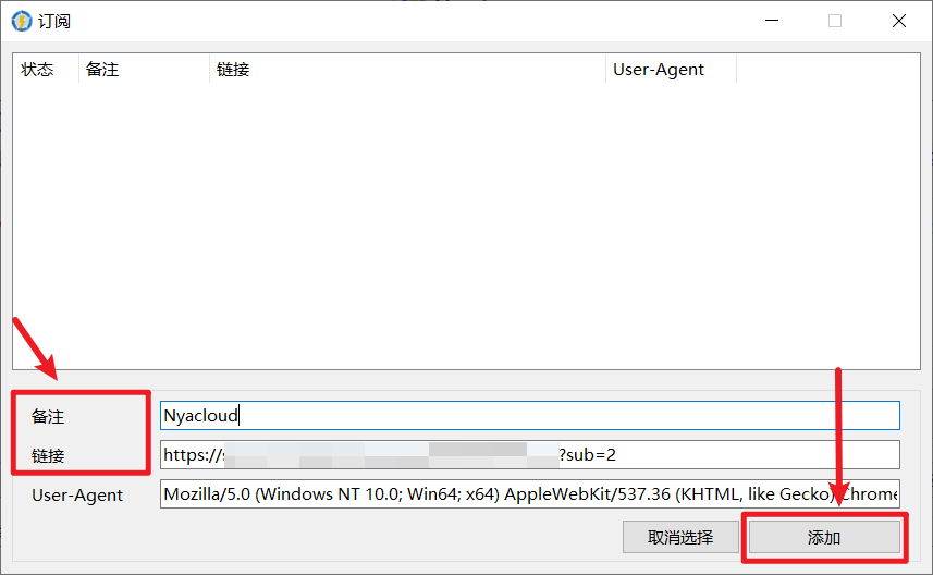 在「链接」处粘贴自己的订阅链接,备注可以自行填写,填写完成后点击添加