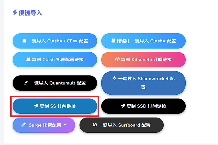 前往「用户核心数据面板」下滑找到便捷导入中的「复制 SS 订阅链接」,点击按钮复制链接